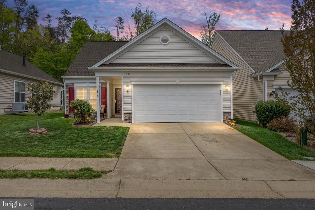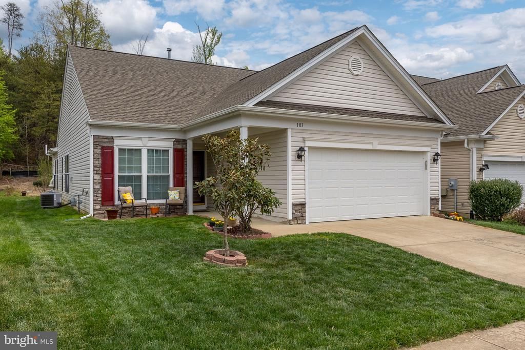 A sense of calm greets you the moment you arrive at 183 Smithfield Way in Fredericksburg, Virginia. Located in the desirable gated Falls Run community, residents enjoy secure gated access and resort-style amenities including a beautifully appointed clubhouse with social gathering spaces, fitness and wellness activities, billiard room, meeting rooms, community events, and beautifully maintained common grounds. The community offers an active lifestyle with walking areas, organized social activities, and low-maintenance living through monthly HOA services. The inviting front sitting area welcomes you in with quiet charm, an ideal spot for slow mornings or relaxing at the end of the day. Inside, the home offers an easy, comfortable flow, with living and dining spaces that feel connected and natural for everyday living. New windows installed 2026 , new roof, gutters, garage door installed 2022 and new higher toilets. At the back of the home, the sunroom becomes a peaceful retreat filled with natural light, perfect for reading, resting, or simply enjoying a quiet moment. Just beyond, the patio provides a calm outdoor space to sit and unwind. The primary suite includes a walk-in closet and a private bath with a double vanity. The second bedroom offers direct access to a full bath, giving guests or everyday use added comfort and convenience. Set within a gated 55+ community and close to shopping, dining, and major routes, this home offers a lifestyle that feels both simple and peaceful. If you’ve been looking for a place that feels easy to come home to, this one is worth a visit.